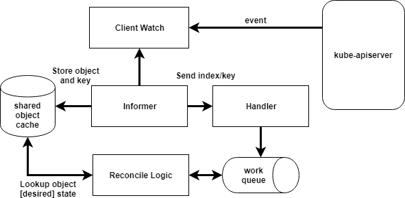 This diagram is not a technically accurate representation of a client-go flow. For detailed technical flows and examples see sample-controller and CloudARK's Writing Kubernetes Custom Controllers Medium post.