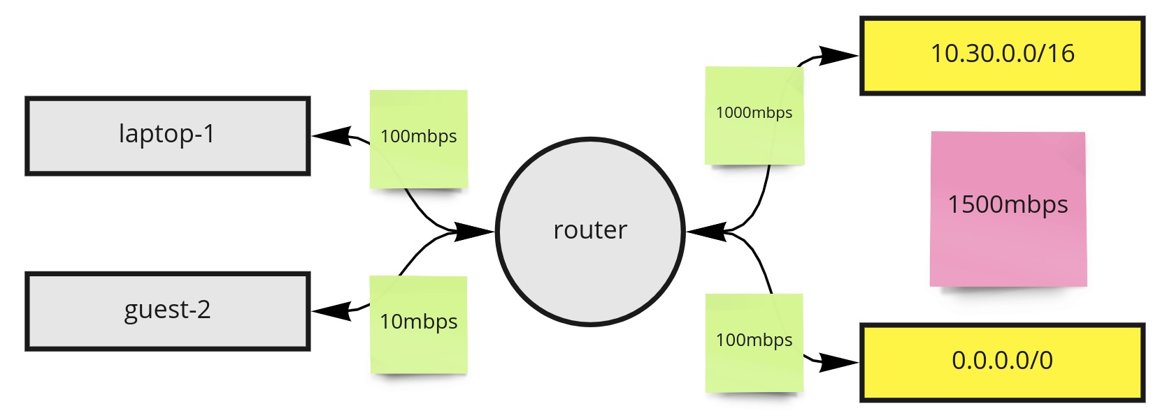 Here we have 2 types of theoretical quality of service settings. To the left of the router, we can see bandwidth limitations imposed on the source device. How we identify the source device may vary, but let's assume something such as the MAC address is used. In the above, laptop-1 will be able to use up to 100mbps, while the device named guest-2 will be limited to 10mbps. On the more complicated end, to the right of the router, we can see outbound throttling happening based on CIDR ranges. In this case, we can assume there is an upper limit for all outbound traffic of 1500mbps. This can be thought of as a quota of available bandwidth owned by the "parent". The children are paths that go to the internal network 10.30.0.0/16 and all other outbound traffic 0.0.0.0/0. In this case, we may want the children to borrow as much bandwidth as is available from the parent. When under contention, we may want to ensure the route to 10.30.0.0/16 is prioritized to receive 1000mbps, even if that means throttling the traffic out to 0.0.0.0/0.