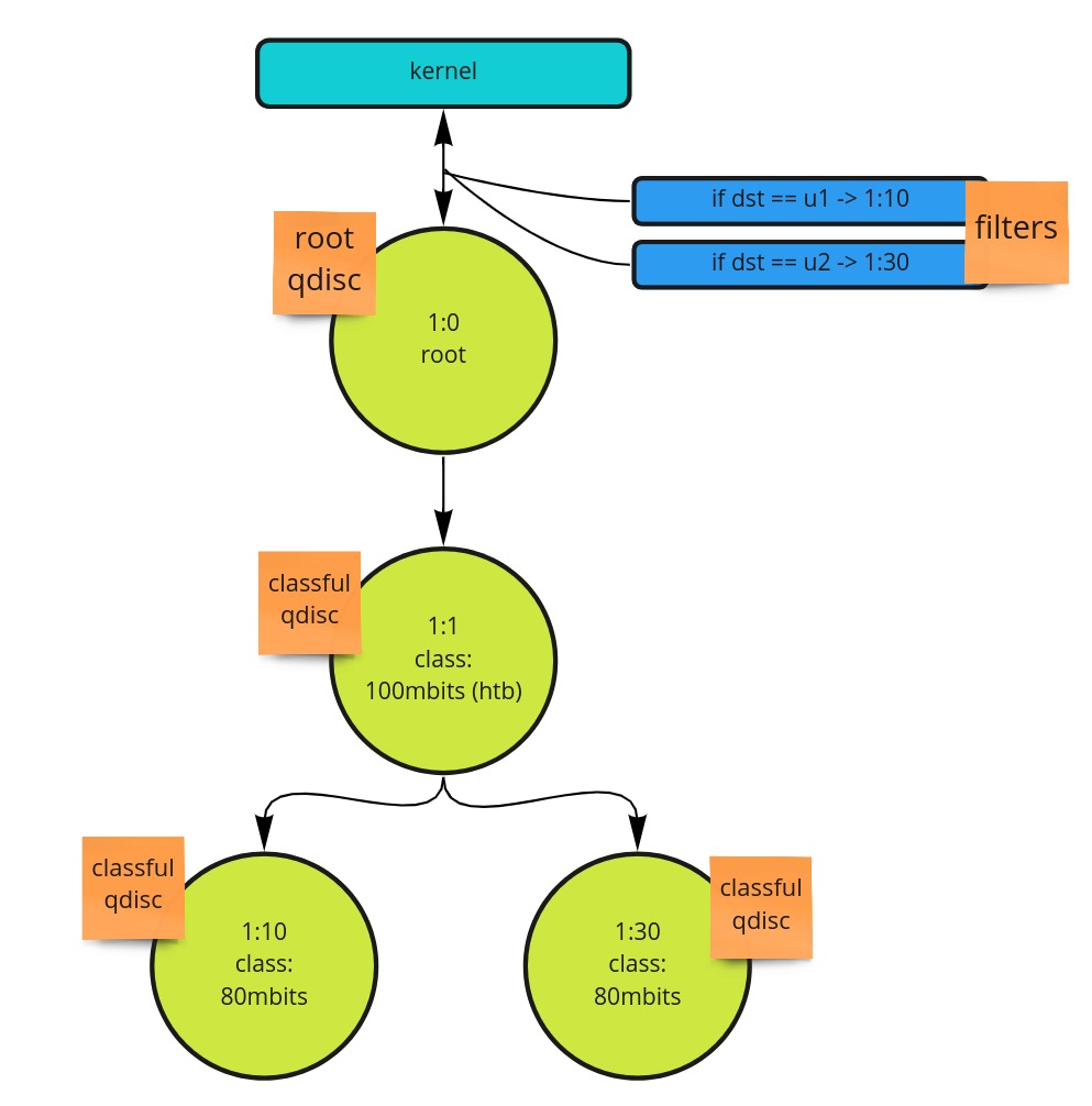 Here we can see a root qdisc, identified as 1:0. This ID is important as it enables us to define it as the parent of other qiscs. The first leaf is the classful qdisc 2:1. In this example, we're assuming it has a total bandwidth of 100mbits. The leaves under that, 1:10 and 1:30, can be considered children of 1:1 and can each transmit up to 80mbits. As children of 1:1, they will be able to borrow, from their base rate, up to 100mbits. If 1:10 and 1:30 were transmitting at full speed, we'd have 160mbits, which would exceed what can be borrowed from the parent. This is an example, where throttling between the two would occur. In that scenario, we'd expect 1:10 and 1:30's transmission rate to drop to 50mbps each. Finally, towards the top, you can see the blue filters being specified. These are essentially looking at the source IP and articulating if traffic is destine for a specific host u0 or u1, the packet will end up queued into 1:10 or 1:30.